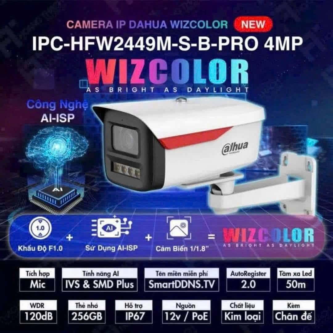 Camera DAHUA DH-IPC-HFW2449M-S-B-PRO là dòng camera IP 4MP công nghệ WizColor, mang đến hình ảnh siêu nét với màu sắc trung thực cả ngày lẫn đêm. Với thiết kế thân trụ hiện đại, khả năng chống nước IP67, cùng công nghệ thông minh AI Detection, sản phẩm phù hợp lắp đặt ngoài trời, nhà xưởng, cửa hàng, biệt thự hay văn phòng.