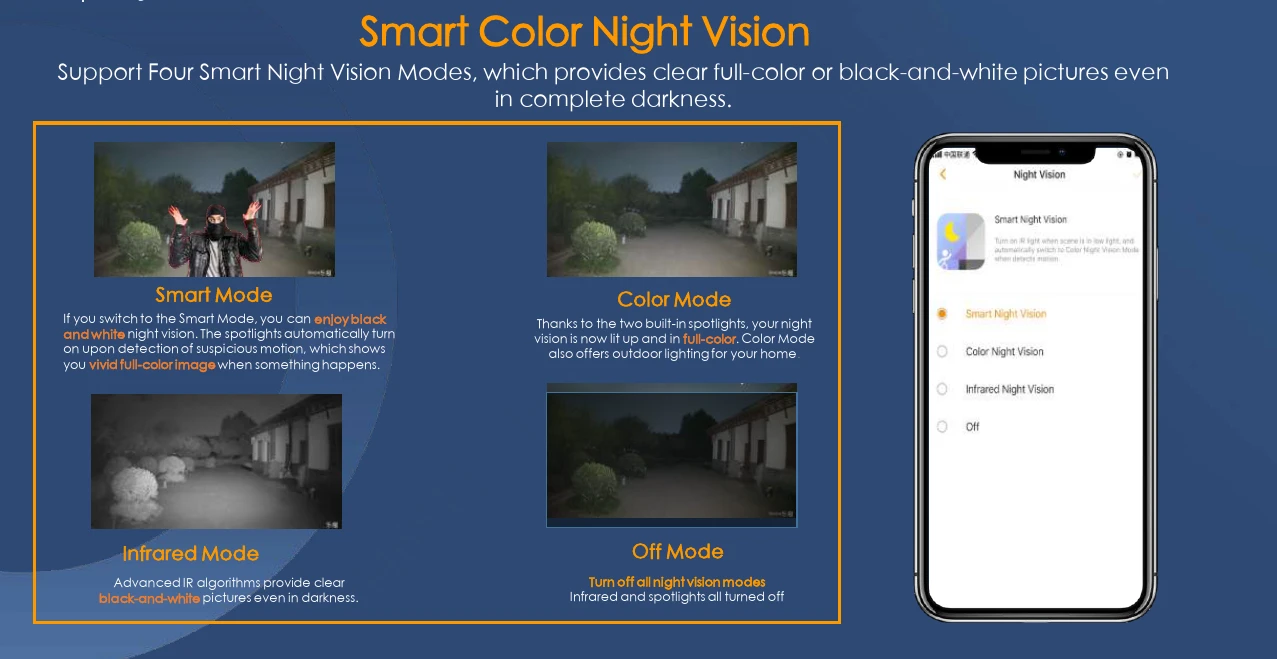 4 chế độ nhìn đêm thông minh – Full Color, IR, Smart Mode, tầm xa đến 30m.