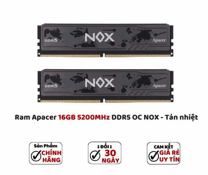 RAM APACER OC NOX 16GB (1X16GB) DDR5 5200MHZ Đenlà dòng RAM hiệu năng cao hướng đến game thủ, designer, editor và người dùng cần tốc độ xử lý nhanh – đa nhiệm mượt – ổn định lâu dài.